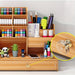 Dit ruimtelijke bureaurek van duurzaam bamboehout helpt je bureau netjes en overzichtelijk te houden. Met diverse vakken voor pennen, markers, notitieboekjes en meer, plus een handige lade voor kleine spullen, is het de perfecte organisatiehulp. De warme, natuurlijke uitstraling van het bamboe past moeiteloos in elk interieur, of het nu thuis of op kantoor is. Dankzij het eenvoudige montagesysteem staat het rek snel klaar om je werkplek te optimaliseren.