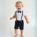 Laat je kleine jongen stralen met dit elegante 3-delige pak. Het setje bestaat uit een lichtblauw overhemd met een donkerblauw strikje, een stijlvol gilet en een nette broek. Perfect voor bruiloften, verjaardagen, familiefeesten of elke andere speciale gelegenheid waar een feestelijke look gewenst is. Dankzij de zachte materialen zit het pak comfortabel, terwijl je kind er toch stijlvol en netjes uitziet.