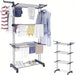 Deze opvouwbare, 3-laagse wasdroger biedt een ruime en flexibele droogoplossing dankzij de 6 vouwbare vakken en twee draaibare panelen. Gemaakt van stevig roestvrij staal met wieltjes voor eenvoudig verplaatsen, is deze droogtoren geschikt voor binnen- en buitengebruik. Het ruimtebesparende ontwerp maakt het mogelijk om veel wasgoed efficiënt te drogen zonder veel ruimte in te nemen.