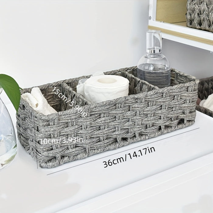 Deze stijlvolle opbergmand is ideaal voor het organiseren van uw badkamerbenodigdheden of andere kleine voorwerpen in huis. Met een prachtig geweven ontwerp voegt het een natuurlijke uitstraling toe aan uw interieur, terwijl het ook functioneel is. De verschillende compartimenten helpen bij het scheiden van items, zodat u altijd snel vindt wat u nodig hebt. Creëer een opgeruimde en aantrekkelijke ruimte met deze praktische en decoratieve mand.